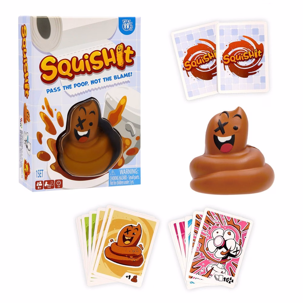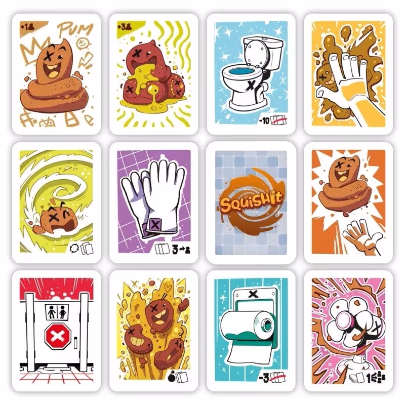 Magnifico Juego de Mesa Squishit? ¡Lanza tu caca! Una temática descarada con cartas de caca y mecánicas ingeniosas para hacer reÃr a todos. Usa cartas de Ataque, Defensa y Limpieza para mantener tu culo limpio mientras arrojas caca a los demás